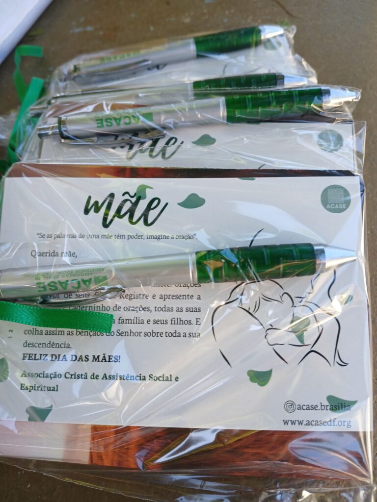 Na segunda quinta-feira de maio (dia 9), por ocasião do Dia das Mães, que seria comemorado no domingo seguinte, os voluntários da ACASE presentearam as mães do Hospital Materno Infantil de Brasília com um lindo “kit oração”, composto de um cartão de “Feliz Dia das Mães”, uma caneta personalizada da Associação e um caderninho de oração.